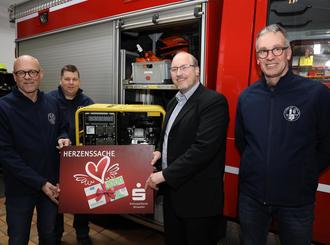 KRIPP. Im Rahmen des Projekts „Herzenssache“ hat die Kreissparkasse Ahrweiler den Förderverein der Feuerwehr Kripp bei der Anschaffung eines Stromerzeugers unterstützt. Dieser tragbare Stromerzeuger wurde kürzlich vom Förderverein an die Feuerwehr Kripp übergeben und der Leiter des Beratungscenter Remagen, Herr Frank Kremer, konnte an dieser Übergabe teilnehmen. Der Stromerzeuger mit einer Leistung von 9 KVA wird im allgemeinem Feuerwehrdienst eingesetzt um Strom für die elektrisch betriebenen Geräte wie z.B. Beleuchtung oder Elektrogroßlüfter zur Entrauchung von Brandstellen betreiben zu können, aber auch um z.B. nach Unwettern und Starkregenereignissen Tauchpumpen oder Wassersauger einsetzen zu können. Der 1. Vorsitzende des Fördervereins der Feuerwehr Kripp e.V. Herr Gerhard Oelsberg und die Einheitsführung der Feuerwehr Kripp bedankten sich ganz herzlich bei Frank Kremer, dass die Kreissparkasse Ahrweiler mit ihrer Spende die Anschaffung des Stromerzeugers finanziell unterstützt hat. Die Gesamtkosten für den Stromerzeuger betragen 6.000,- Euro.
