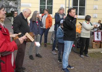 Im Anschluss sprach Bürgermeister Björn Ingendahl, der die Aktion sehr begrüßte und auf die Wichtigkeit hinwies, dass sich angesichts der Bedrohung durch undemokratische und ausgrenzende Ideologien möglichst viele aktiv für Toleranz und Vielfalt einsetzen. Dann gab er das Startzeichen für fünf Minuten Krach und es wurde richtig laut: Trommeln, Tröten, eine Trompete und viele Kochtöpfe sowie andere Krachinstrumente wurden heftig genutzt um ein lautes Zeichen gegen Rassismus zu setzen.