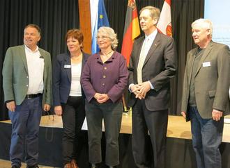 Kreisbeigeordneter Friedhelm Münch, Barbara Heimbach und Karin Keelan vom Friedensmuseum, Generalkonsul Norman Thatcher Scharpf und Beigeordneter Volker Thehos bei der Gedenkfeier in der Rheinhalle Remagen.