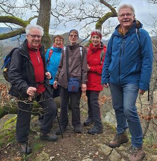 REMAGEN. Eine Wanderung des Remagener Eifelvereins führte in das schöne Ahrtal. Die anspruchsvolle Tour begann mit dem Aufstieg von Mayschoß / Laach durch die Weinberge und Wälder zum Schrock. Dort genossen die Wanderbegeisterten die Mittagspause mit eindrucksvoller Aussicht Richtung Mayschoß und Altenahr und die Mühe des steilen Aufstiegs war schnell vergessen. Danach ging es weiter auf den Steinerberg, mit seinen wunderbaren Panoramen auf das Ahrtal und darüber hinaus auf das Siebengebirge und die Grafschaft. Der fabelhafte „Hüttengeist“ Rolf erzählte seltsame Geschichten rund um sein Reich. Etwa über den Ursprung des Hochkreuzes mit der Inschrift „Flucht nach Ägypten“. Danach führte die Wanderung entlang des Langfigtals, das nach der verhängnisvollen Flut 2021 eine neue Gestalt bekam, aber immer noch einzigartig ist. An der Jugendherberge vorbei, die seit der Flut geschlossen ist, gelangte die Gruppe über die Furt nach Altenahr. Dann ging es mit Schienenersatzverkehr und Ahrtalbahn zurück nach Remagen.