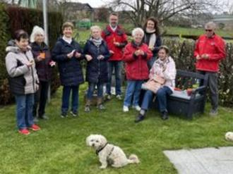 Die Spaziergangsgruppe mit Gästen am Gründonnerstag. In den Händen die Osterüberraschungen Schoko- und Ostereier sowie leckeres Kräutersalz.