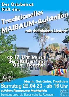 Am Samstag, 29. April 2023 wird auf dem Marktplatz Remagen das feierliche Stellen des Maibaums durch die Freiwillige Feuerwehr stattfinden. Die alljährliche Tradition wird in diesem Jahr durch ein musikalisch-fröhliches Programm mit rheinischen Liedern begleitet. Hierzu sind alle Bürgerinnen und Bürger sowie Gäste unserer Stadt herzlich eingeladen. Die Feuerwehr beginnt um ca. 15 Uhr mit den Vorbereitungen zum Stellen des Maibaums und ab 16 Uhr startet auf dem Marktplatz das rheinisch-musikalische Programm in Kooperation mit der Kulturwerkstatt Remagen. Der Ortsbeirat und alle unterstützenden Akteure freuen sich auf einige fröhliche Stunden mit vielen Besuchern dieser schönen Tradition.