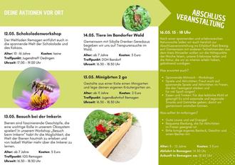 Am Freitag, 16. Mai 2025, 15:00 – 18:00 Uhr geht die grüne Aktions-Woche mit einem großen Abschluss-Event im Eifeldorf Bad Breisig zu Ende. Die Teilnehmer aus dem gesamten Kreis Ahrweiler können gemeinsam an verschiedenen Workshops und Team-Spielen im Freien teilnehmen, erfahren, was die anderen Kommunen zum Thema gemacht haben, und saisonale/regionale Snacks und Getränke genießen. Es können Ideen gesammelt und ausgetauscht und Bekanntschaften mit Gleichgesinnten geschlossen werden. Im Zuge der Nachhaltigkeit bringt jeder sein eigenes Geschirr und Besteck mit. Anmeldungen nehmen die Jugendbüros vor Ort entgegen.
