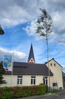 Die Oedinger Ortsmitte mit Ortsfahne und Maibaum.