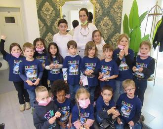 Dr. Imane Afker und ihre Kinder begrüßen die Löwenkinder (Vorschulkinder) der Kita Pusteblume-Löwenzahn aus Kripp in ihrer Zahnarztpraxis in Remagen.