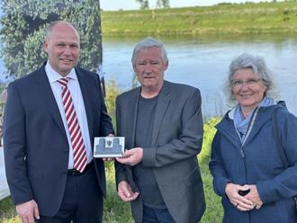 Zum 80. Jubiläum des „Elbe-Days“, hatte die Stadt Torgau die Idee, die Stadt Remagen und das Friedensmuseum, als Ehrengäste einzuladen. Dabei überreichten Karin Keelan und Volker Thehos dem Torgauer Oberbürgermeister Simon einen Originalstein der Brücke von Remagen.
