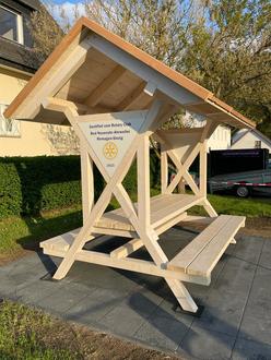 WALPORZHEIM. „Kann man wieder an die Ahr fahren?“, fragen sich viele Menschen, die jahrelang ihren Urlaub an der Ahr verbracht haben und gerne an die schöne Stunden zurückdenken. Es wird noch eine lange Zeit dauern, bis das Ahrtal wieder die Vielfalt und den Charme wie in der Zeit vor der Flutkatastrophe bieten kann. „Als Serviceclub gilt es jetzt, unsere schöne Heimat beim Aufbruch zu unterstützen“ gab Dieter Zimmermann, Präsident des Rotary Clubs Bad Neuenahr-Ahrweiler, den Club-Mitgliedern als Motto für 2023 vor. Eine großartige Möglichkeit zur Rast für Wanderer und Radfahrer wurde jetzt durch die beiden Rotary Clubs aus Bad Neuenahr-Ahrweiler und Remagen-Sinzig in Walporzheim geschaffen. Die neue überdachte Sitzgruppe, bestehend aus Tisch und zwei Bänken, lädt Gäste und Einheimische im verkehrsberuhigten Bereich des Ortes zum entspannten Verweilen ein.