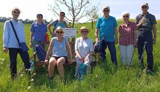 Die Wandergruppe auf einer Blumen- und Obstwiese in Weibern.
