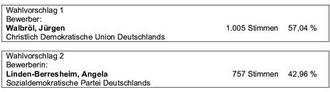 Auf Grund dieses Wahlergebnisses hat der Bewerber Walbröl, Jürgen mehr als die Hälfte der gültig abgegebenen Stimmen erhalten. Er ist somit zum Ortsvorsteher des Ortsbezirks Oberwinter gewählt.