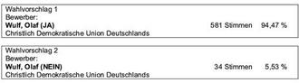 Auf Grund dieses Wahlergebnisses hat der Bewerber Wulf, Olaf mehr als die Hälfte der gültig abgegebenen Stimmen erhalten. Er ist somit zum Ortsvorsteher des Ortsbezirks Oedingen gewählt.