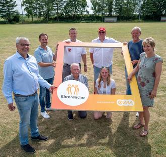 Theo Schröder von der evm übergibt den Spendenbetrag gemeinsam mit Bürgermeister Björn Ingendahl und Ortsvorsteher Olaf Wulf an Vertreter und Vertreterinnen der beiden begünstigten Vereine.