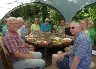 REMAGEN / SINZIG. Ein sonniger und heißer Sonntag war angekündigt. Nichts destotrotz machten sich elf Mitglieder der Ortsgruppe auf den Weg. Zu Beginn der Wanderung musste ein steiler Anstieg auf den Hellenberg genommen werden. Das brachte ausnahmslos die „Bergsteiger“ ins Schwitzen. Belohnt wurde die Mühe mit einem tollen Rundumblick vom Felten Turm. Kurze Verschnaufpause und weiter ging es den Panoramaweg im Halbschatten, bis bei einem Halt der neue Generationenwald 2.0 der Stadt Sinzig erreicht wurde. Nächstes Ziel war das berühmte Winzerhäuschen. Ein großer Tisch, an dem die ganze Wandergruppe Platz fand, läutete den Genussanteil der Wanderung ein. Alle genossen den Ahr- und Mittelrheinwein zu leckerem Spießbraten. Mittlerweile hatte eine Live-Kapelle ihren Platz eingenommen und untermalte den Aufenthalt mit angenehmer Musik. Doch nun ging es durch den schattigen Wald zurück Richtung Sinzig. Wohlbehalten, ohne Hitzeschäden, wurde der Ausgangsort – die Jahnwiese – erreicht. So ging die Genusswanderung der Ortsgruppe Remagen zu Ende. Gäste sind zu allen Wanderungen willkommen. Informationen unter www.Eifelverein-Remagen.de.