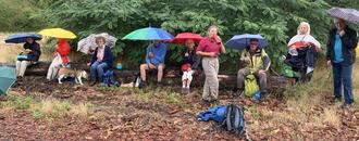 UNKELBACH / OEDINGEN. Der alte Wanderspruch: Es gibt kein schlechtes Wetter, es gibt nur unpassende Kleidung, galt auch für die zehn Wanderer des Remagener Eifelvereins, die bei leichtem Nieselregen von Unkelbach aus aufbrachen, um die nähere Umgebung zu erkunden. Das erste Ziel war der Bentgerhof, auf einer Anhöhe oberhalb Oedingens, der im Jahre 1996 in eine hochmoderne Pferdepension umgebaut wurde. Die Wandergruppe war von dem Anblick der vielen Pferde auf der Weide begeistert. Mitten durch den Bentgerhof verläuft der Jakobsweg mit der Teilstrecke Bonn-Venusberg - Bad Neuenahr - Moselkern. Diesem folgte die Remagener Wandergruppe. Zunächst vorbei an Raps- und Weizenfelder, später durch lichten Laubwald. An der Kreuzung des Jakobsweges mit dem lokalen Wanderweg A4 wurde das neue Ziel, Dungkopf, angesteuert. Nach einer Rast im Regen wurden noch die drei Seen in den aufgegebenen Basaltsteinbrüchen besichtigt, bevor die letzte Teilstrecke – bergab nach Unkelbach – dann mit geschlossenem Schirm erfolgte.
