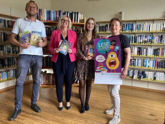 Silke Seul (2.v.l) und Lara Wypior (3.v.l.) von der Kreissparkasse Ahrweiler zu Besuch in der Bücherei Oberwinter