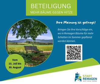 Im Rahmen der KIPKI-Förderung des Landes Rheinland-Pfalz stehen der Stadt Remagen 20.000 € zur Verfügung, welche für die Verschattung des öffentlichen Raums eingesetzt werden sollen. Hiervon können beispielsweise Baumpflanzungen an Spielplätzen, Bänken oder anderen Plätzen finanziert werden. In der Befragung haben Bürgerinnen und Bürger im Zeitraum vom 15. Juli bis zum 30. August 2024 die Möglichkeit, ihre Vorschläge für neue Baumpflanzungen einzutragen. Gleichzeitig werden in der Umfrage auch Orte abgefragt, die sich durch eine große Belastung bei Hitze auszeichnen. „Unsere Bürgerinnen und Bürger wissen vor Ort am besten, wo es im Sommer sehr heiß wird und wo Schatten Abhilfe schaffen kann“, ruft Bürgermeister Björn Ingendahl zur Teilnahme an der Umfrage auf.
