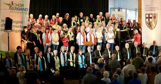 Nach kurzen Schlussworten von Günter Nerger und vom Präsidenten des Chorverbands RLP, Karl Wolff, bat Wilfried Schäfer, der auch Kreis-Chorleiter ist, alle Chöre auf und vor die Bühne, um gemeinsam mit dem Publikum in der Festhalle das Schlusslied „Kein schöner Land“ zu intonieren, was vorzüglich gelang, schließlich waren im Publikum ja auch Abordnungen von Chören aus dem gesamten Bundesgebiet.