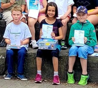 Pia Berresheim (1. Preis mit 110,00 Punkten). Für alle Kinder, die teilgenommen und sich der Herausforderung kniffliger Rechenaufgaben gestellt haben, gab es eine Teilnehmerurkunde und ein Puzzlespiel. Für die drei Preisträger gab es als Preise naturwissenschaftliche Spiele und für das Mathe-AS Pia, für den weitesten Kängurusprung, noch ein T-Shirt. Die Siegerehrung erfolgte im Freiluftklassenzimmer der Schule unter großem Jubel aller stolzen Dritt- und Viertklässler*innen.