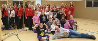 Funkengarde und Minis mit Olaf Wulf vor dem Trainings- und Übungsspiegel