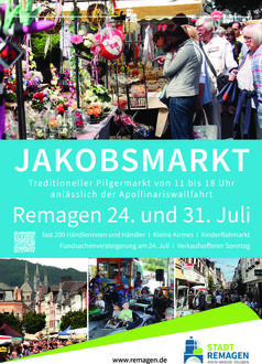 Zum diesjährige Jakobsmarkt wird es am 31. Juli einen Kinderflohmarkt in der Remagener Bachstraße geben. Hier können Kinder bis 14 Jahre in der Zeit von 11 bis 18 Uhr ihr Spielzeug und andere Dinge verkaufen. Die Teilnahme am Flohmarkt ist kostenlos und ohne vorherige Anmeldung möglich. Der Verkauf von Neuware ist nicht gestattet.