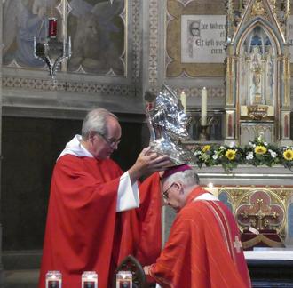 Pater Bartholomé segnet Bischof Voderholzer mit dem Haupt des St. Apollinaris