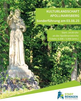 Wer sich für die Kultur- und Klosterlandschaft am Apollinarisberg interessiert, erhält bei einem geführten Spaziergang unter der Leitung von Dr. Erhard Wacker am Sonntag, dem 3. August, viele Hinweise auf Besonderes, was man normalerweise unbeachtet passiert. Die Themen am Wegesrand zwischen Apollinariskirche und Waldschlösschen sind u. a. Kreuzweg, Klostermauern, Rote Erde, Apollinaris-Eiche, ehemalige Klostergüter, Lorendamm, Tongruben, Grenzsteine und -gräben, Franziskusstatue und Wingert Scharfenberg.