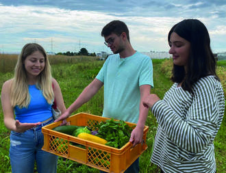 Studierende des RheinAhrCampus Remagen ernten Gemüse auf dem Marktgarten Kukurudza in Roisdorf. V.l.n.r: Marina Nasibova, Vasiliki Tsapali, Sebastian Berg