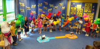 Bei feierlicher Musik zogen die zukünftigen Erstklässler mit ihren Schultüten in die Wolkengruppe ein. Mit dem Lied: Bald geht die Schule los verabschiedeten sich die Kinder. Die Eltern und die Schulgeparden hatten eine Überraschung für die Kindergartengemeinschaft vorbereitet. Frau Victoria Dicken, blickte stellvertretend für alle Familien auf die vergangene, ereignisreiche und erfolgreiche Zeit zurück. Die Kinder überreichten jedem Teammitglied einen Blumengruß. Damit die Schulgeparden nicht vergessen werden, übergaben alle Vorschulkinder eine wunderschöne Fußmatte gestaltet mit Handabdrücken und Namen. Diese verschönert nun den Eingangsbereich der Kita Unkelbach.