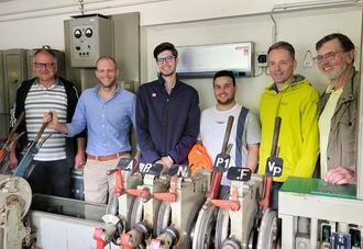 Bleibt die Technik mechanischer Stellwerke sichtbar? Darüber berieten (v. l.) Edgar Steinborn (IG Ahrtalbahnfreunde), Dirk van Kaathoven, Jonas Haffmann, Abdullah Alsali, Christian Sauer (alle DB Netz) und Wolfgang Groß (Ahrtalbahnfreunde) im Stellwerk Ahrweiler.