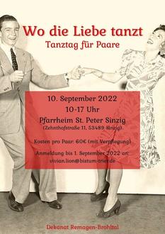 DEKANAT/SINZIG. Sie sind ein Paar und haben vor, demnächst zu heiraten oder wollen als Paar gemeinsam in Bewegung kommen? Beim Tanztag für Paare sollen in Begleitung eines Tanzlehrers die Wirkungen des Tanzes und Themen rund um Partnerschaft miteinander in Beziehung kommen am 10. September von 10 bis etwa 17 Uhr. Die Teilnahmegebühr pro Paar beträgt 60 Euro (Mittagessen inklusive). Anmeldung bis 1. September bei vivian.lion@bistum-trier.de.
