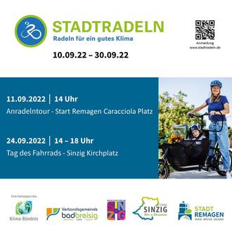 In diesem Jahr steht die Aktion Stadtradeln wieder im Licht der interkommunalen Zusammenarbeit. Vom 10. bis zum 30. September 2022 nehmen die Städte Remagen, Sinzig und Stadt Bad Breisig am Stadtradeln teil und bieten mit Unterstützung der Fahrrad AG des Bürgerforum Sinzig verschiedene Aktionen an.