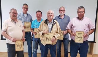 Für lange Mitgliedschaft geehrt (v.l.): Wolfgang Langenbach (25 Jahre), Reiner Herrmann (25 Jahre), Martin Westdickenberg (25 Jahre), Erich Odenthal (50 Jahre), Horst Schettler-Köhler (25 Jahre) und Andreas Schneider (25 Jahre). In Abwesenheit wurde noch Marlies Schmitz für 10 Jahre und Ralf Schmitz für 25 Jahre geehrt.