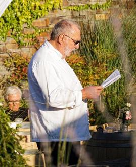 Autor Frank Krajewski begrüßte die Gäste, zu denen auch Hanne Briesch zählte. Sie hatte mit bemalten Ahrufer-Steinen über 10.000 Euro zugunsten von Flutopfern erwirtschaftet. Ebenfalls begrüßte er seine Freunde Colette und Jean-Marie Dumaine, die das Vieux in Sinzig bewirtschafteten. Krajewski ließ Revue passieren, wie die Freundschaft mit den Dumaines entstand und sich über viele Jahre entwickelte. Im Jahre 2002 entdeckte Jean-Marie Dumaine die ersten Trüffel im Ahrtal. Nach diesem Fund wurde 2006 das erste Trüffel-Symposium Deutschlands in Sinzig durchgeführt. Anschaulich und humorvoll erzählte Krajewski kulinarische Anekdoten aus seiner Kindheit und Jugend. Sein Erzähltalent ist weit über die Grenzen Kripps bekannt. Seit 42 Jahren lebt er in dem kleinen Ort am Rhein.