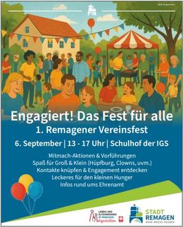 Die Stadt Remagen lädt alle Bürgerinnen und Bürger herzlich ein, die bunte Vielfalt der örtlichen Vereine und ehrenamtlichen Initiativen zu entdecken. Unter dem Motto „Engagiert!“ erwartet die Besucher ein spannender Nachmittag voller Action, Spaß und vielfältiger Einblicke – hier ist wirklich für alle etwas dabei! Ob Sport, Handarbeit, Musik, Karneval, Feuerwehr, DLRG oder DRK – die Remagener Vereine präsentieren sich mit einem abwechslungsreichen Programm, das Jung und Alt begeistert. Auch für die jüngsten Gäste ist bestens gesorgt: Eine Hüpfburg sorgt für Bewegung und zwei Clowns bringen die Kinder mit Spiel und Spaß zum Lachen. Langeweile hat hier keine Chance! Mitmachen ist ausdrücklich erwünscht! Für alle, die bereits ehrenamtlich aktiv sind, stellt die Kreisverwaltung Fördermöglichkeiten im Bereich Vereine sowie die Ehrenamtsschule vor. Zudem wird der Landessportbund Rheinland-Pfalz vor Ort sein und das wichtige Thema Inklusion beleuchten. Freuen Sie sich auf einen abwechslungsreichen und bunten Nachmittag voller Begegnungen, Spaß und Gemeinschaft – wir freuen uns auf Ihr Kommen! Weitere Informationen erhalten Sie bei der Stadtverwaltung Remagen, Stefanie Ehlert, Tel: 02642-20163 oder per email: Stefanie.ehlert@web.de