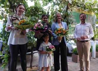 Bürgermeister Björn Ingendahl (r.) freut sich über Remagens neue Weinrepräsentanz mit Weinkönigin Maria Pinger (2.v.l., mit Tochter Malaika) und ihren Prinzessinnen Jasmin Karlin (l.) und Anja Herrmann.