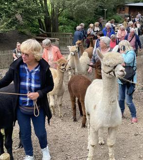 Als Krönung konnte man noch mit einem angeleinten Tier seiner Wahl einen Spaziergang unternehmen und dabei erfahren, warum man Alpakawanderungen auch zur Entschleunigung anbietet: Man muss sich dem gemächlichen Tempo dieser herrlichen Tiere schon anpassen und wird automatisch zum gemütlichen Gehen gebracht.
