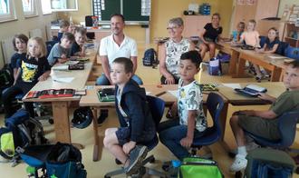 Bürgermeister Ingendahl und Schulleiterin Doris Rheindorf mit der Klasse 1c und Lehrerin Janica Linn (hinten) im neuen Klassenraum