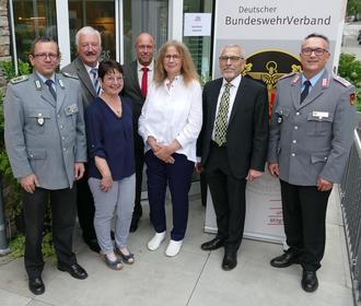 Geschäftsführender Vorstand der KERH mit den Ehrengästen: Beigeordnete Ute Reuland (3. v. r.), Oberstleutnant Michael Schwab (r.) und StFw Schwappacher (l.)
