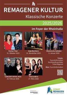 Das Klassik-Abonnement für fünf Konzerte kostet 99 Euro (anstatt 116 Euro) im Normalpreis und 89 Euro (anstatt 105 Euro) ermäßigt. Einzeltickets kosten 22 Euro (ermäßigt 20 Euro) bzw. für das Neujahrskonzert 28 Euro (ermäßigt 25 Euro). In dieser Spielzeit dürfen sich Klassikfreunde auf besondere Höhepunkte freuen. Das Duo Pariser Flair nimmt ihre Zuhörerinnen und Zuhörer in der Rolle als Stadtführerinnen mit auf eine musikalische Reise durch die Metropole an der Seine, gefolgt von der Violinistin Anja Borchers mit ihrem „Mozärtlichen Kammermusikabend“. Nach über 20 Jahren verabschiedet sich Gerd Winzer mit den Rheinischen Solisten beim Neujahrskonzert 2026 vom Remagener Publikum. Im Anschluss präsentieren das Ensemble CONCERT ROYAL Köln und das TrioConBrio weitere musikalische Glanzlichter für die Remagener Klassik.
