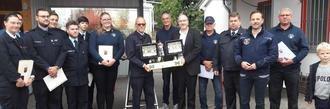 Geehrte und Beförderte mit Bürgermeister Ingendahl (3.v.r.), Ingo Wolf (4.v.r.), sowie Frank Kremer und Gerhard Oelsberg mit neuem Beleuchtungssatz