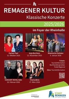 In dieser Spielzeit dürfen sich Klassikfreunde auf besondere Höhepunkte freuen. Nach dem Duo Pariser Flair folgt ein „Mozärtlicher Kammermusikabend“ mit der Violinistin Anja Borchers, bevor sich Gerd Winzer und die Rheinischen Solisten beim Neujahrskonzert 2026 nach über 20 Jahren von ihrem Remagener Publikum verabschieden. Zum Abschluss präsentieren das Ensemble CONCERT ROYAL Köln und das TrioConBrio weitere Höhepunkte der klassischen Musik.