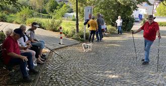 An der zweiten Ruhebank (Feldscheune im Wirtschaftsweg) wurde dann die Rast mit einem Becher Wasser begrüßt, bevor der idyllische Platz an der „alten Kapelle“ am Friedhof angesteuert wurde. Zwischen zwei Ruhebänken, die sofort in Anspruch genommen wurden, gibt es einen neuen Informationsschaukasten welcher reichlich bestückt war. Neugierig und interessiert kamen einige Fragen auf, die hinreichend beantwortet wurden. Abschließend suchte die Gruppe dann nochmals das Pfarrheim im Ort auf. Dort erwarteten die Spaziergängerinnen und Spaziergänger ein liebevoll gedeckter Tisch mit Kaffee und selbstgebackenen Kuchen – gebacken von Martina Wulf, der Gattin des Ortsvorstehers.