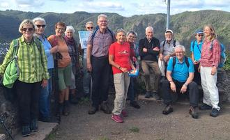 Ein langer, bewaldeter Aufstieg startete dann vom Bahnhof Neef. Ging es doch hinauf auf den 421 m hohen Hochkessel im Innern der Bremmer Moselschleife. Der Hochkessel ist einer der höchsten Erhebungen an der Mosel auf der Hunsrückseite. Vom höchsten Punkt der Wanderung ging es stets leicht bergab über den Petersberg zur Klosterruine Stuben, einem ehemaligen Augustiner Chorfrauen Stift. An der Stelle der Klosterruine Stuben wurde bereits 1146 n.Chr. die erste Kapelle errichtet. Auf dem Petersberg konnte die fast 900 Jahre alte Petersbergkapelle mit dem wertvollen Altar aus der Spätrenaissance besichtigt werden. Über den Höhenfriedhof ging die Gruppe zum Aussichtspunkt Eulenköpfchen mit schönem Blick auf die Mosel mit Neef und der Staustufe. Der Bergrücken wurde bereits von den Kelten und Römer bewohnt, welches durch Ausgrabungen nachgewiesen wurde. Beim weiteren Weg durch die abfallenden Weinberge boten sich herrliche Blicke auf den 150 m hohen Calmont mit seinem Klettersteig, sowie mehrere Gleitschirmflieger am Himmel. Entlang der Mosel wanderte die Gruppe unterhalb der Felsen und steilen Weinberge zurück nach Neef. Unter einem mächtigen Esskastanienbaum am Dorfplatz fand, bei einem Glas Moselwein, die Wanderung ihren Abschluss.