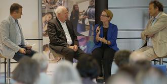 In der zweiten Talkrunde kamen mit Prof. Dr. Stefan Sell und Prof. Dr. Thomas Wilhein die beiden dienstältesten Professoren des Remagener Campus zu Wort, die neben ihrer umfangreichen Lehrtätigkeit auch noch sehr viel Aufbauarbeit leisten mussten. „Es war einerseits eine sehr anstrengende Zeit. Andererseits konnten wir aber auch unsere eigenen Ideen einbringen und so unsere Spuren hinterlassen“, so Wilhein über die damalige Aufbruchstimmung. Mit in der Runde saß die seit sechs Jahren im Remagener Fachbereich Wirtschafts- und Sozialwissenschaften tätige Mitarbeiterin Daniela Müller, die damals zu den ersten 119 Studierenden gehört hatte. Auch sie berichtete von der guten Stimmung, aber auch von den Herausforderungen ihres Studiums: „Während wir drinnen lernen mussten, lenkte uns draußen der Baulärm oftmals sehr ab.“