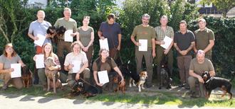 Der diesjährige Kurs war eine bunt gemischte Truppe mit Bracken, Terriern, Schweißhunden, einem Deutsch-Drahthaar, einem Langhaar-Teckel sowie einem Weimaraner. „Beim ersten Treffen des diesjährigen Lehrgangs im März war schnell klar, dass wir noch etwas üben müssen, um die Prüfung zu bestehen“ berichtet Ralf Bockshecker, der sich mit seinem Hund Fritz der Herausforderung stellte. Die Lehrgangsleiter Katharina Dillman und Hannes Fritz lobt er für deren Fachwissen, Engagement und Enthusiasmus: „Selbst für jemanden wie mich, der schon einige Hunde ausgebildet und viele Jahre geführt hat, ist es doch immer wieder äußerst lehrreich, die Tipps und Tricks in der Hundeausbildung von Fachleuten wie Katharina und Hannes umzusetzen und so am Ende ein fast schon verloren geglaubtes Ziel doch noch zu erreichen.“