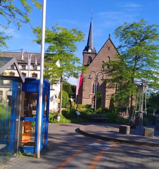 Die beliebte blaue Büchereitelefonzelle in Kripp auf dem Dorfmittenplatz