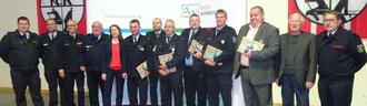 Die Geehrten der Feuerwehr Remagen mit Landrätin Weigand, dem zweiten stv. Beigeordneten Volker Thehos und den Wehrleitern.