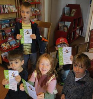 Die Bandorfer Schuldinos waren eifrig dabei und sehr interessiert am Thema Buch und Bibliothek. Zum letzten Treffen in der Bücherei brachten sie einige Eltern und Geschwister mit und erforschten die Räume der Bücherei. Nach der selbsttätigen Rückgabe der ausgeliehenen Bücher und einem kleinen Spiel lauschten Groß und Klein einer letzten Geschichte von Furzipups, dem kleinen Drachen. Die Übergabe der Urkunden rundete den Vormittag und das Ende der Aktion BIBFIT ab.