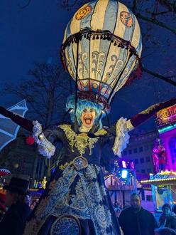 Flying Traveller: Diese schwebende Reisegesellschaft hat sich ganz der Luftfahrt der Jahrhundertwende verschrieben. Als Ballon-Ladys gleiten sie scheinbar mühelos über den Köpfen der Zuschauerinnen und Zuschauer. Bei Dunkelheit werden ihre Ballons und Kostüme durch aufwendige Lichttechnik zum Leuchten gebracht – ein farbenfrohes Schauspiel, das zum Träumen einlädt.