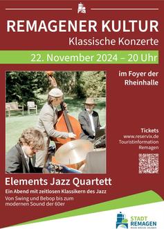 Mit seinem dynamischen Auftritt und raffinierten Klangbildern bringt das Elements Jazz Quartett nicht nur Pariser Flair ins Foyer der Rheinhalle Remagen, sondern leitet am 22. November 2024 auch die neue Klassik-Spielzeit in Remagen ein.