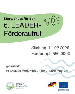 Die Lokale Aktionsgruppe (LAG) Rhein-Ahr eröffnet ihren 6. LEADER-Förderaufruf und lädt Bürgerinnen und Bürger, Vereine sowie kommunale Gebietskörperschaften herzlich dazu ein, innovative Projektideen für die Region einzureichen. Für die Förderung stehen insgesamt 550.000 Euro zur Verfügung – davon 500.000 Euro aus ELER-Mitteln und 50.000 Euro aus Landesmitteln.